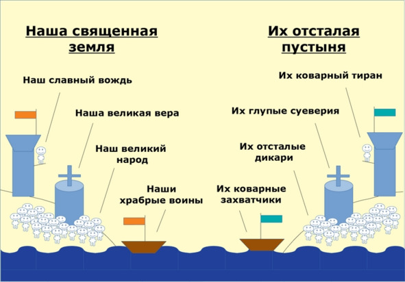 Это отражается даже в языке. Например, «своих шпионов» представители любого общества называют разведчиками и относятся к ним как к национальным героям, а чужих разведчиков те же самые люди называет шпионами и неизменно осуждают их. Или, например, «своих солдат» на чужой территории люди называют храбрыми освободителями, а чужих солдат – трусливыми захватчиками. «Своих террористов» люди называет диверсантами, а чужих диверсантов – террористами. Потому что, одно дело – свои люди, а другое дело – чужие люди. Свои люди всегда ближе и на фоне чужих людей всегда выглядят более нравственными, благородными, разумными и правыми. Вопрос только в том, с кем люди себя идентифицируют и кого именно они считают «своими».