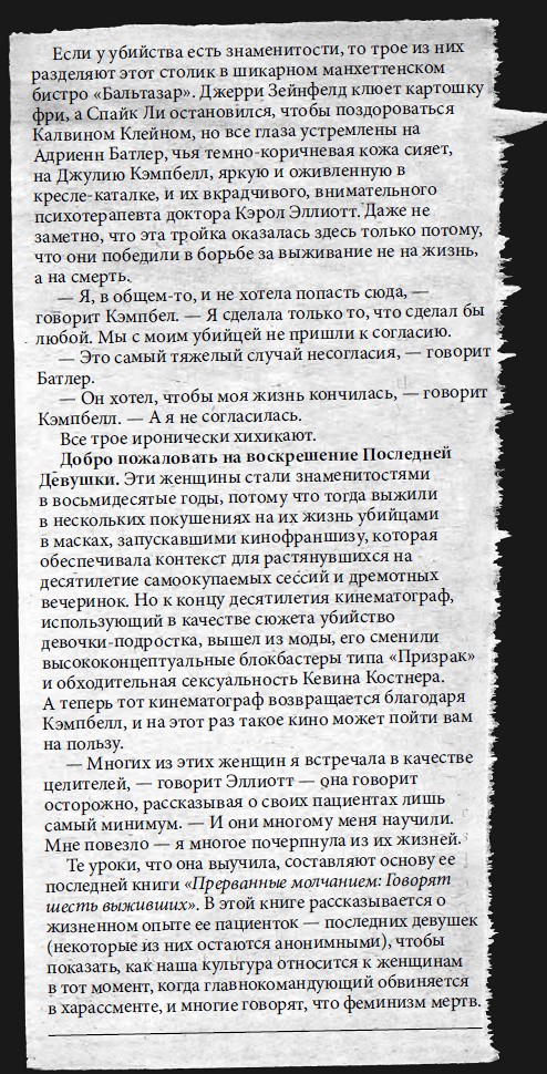Мне нужно вернуться домой, но я не могу ломать свою рутину. Я должна узнать, что случилось с Адриенн. Мэрилин дочитала остальную часть статьи с экрана своего телефона, но подробностей было мало: Адриенн была убита в своем доме мужчиной, но мне этого хватало, потому что именно с Адриенн из всей группы я разговаривала больше всего, именно к ней приезжала каждый месяц. Ну, хорошо, раз в два месяца. Иногда раз в три месяца, а в этом году, может, и того реже, но казалось, что и это немало. Суть в том, что она всегда находила для меня время.