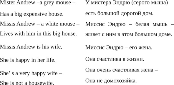 Вашему вниманию предлагается полезное изучения английского языка соединение учебника, пособия, небольшого словаря и легкой для чтения дополнительной литературы, всего понемногу. Основные слова и разговорные шаблоны зарифмованы, введены в сюжетный текст и их легко запомнить. Текст разделен на фрагменты/Units, которые можно рассматривать как отдельные уроки, каждый фрагмент иллюстрирован оригинальным цветным фото строго по тексту фрагмента. Я не привожу транскрипцию, потому что в интернете вы легко найдете правильное и эталонное произношение носителей языка. Надеюсь, что эта небольшая книжка сможет помочь начать использовать английский язык в ваших целях и что Вы получите удовольствие от знакомства с героями этого текста. Вы узнаете, как живут персонажи – мистер Эндрю и миссис Эндрю, чем они занимаются, как проводят время.