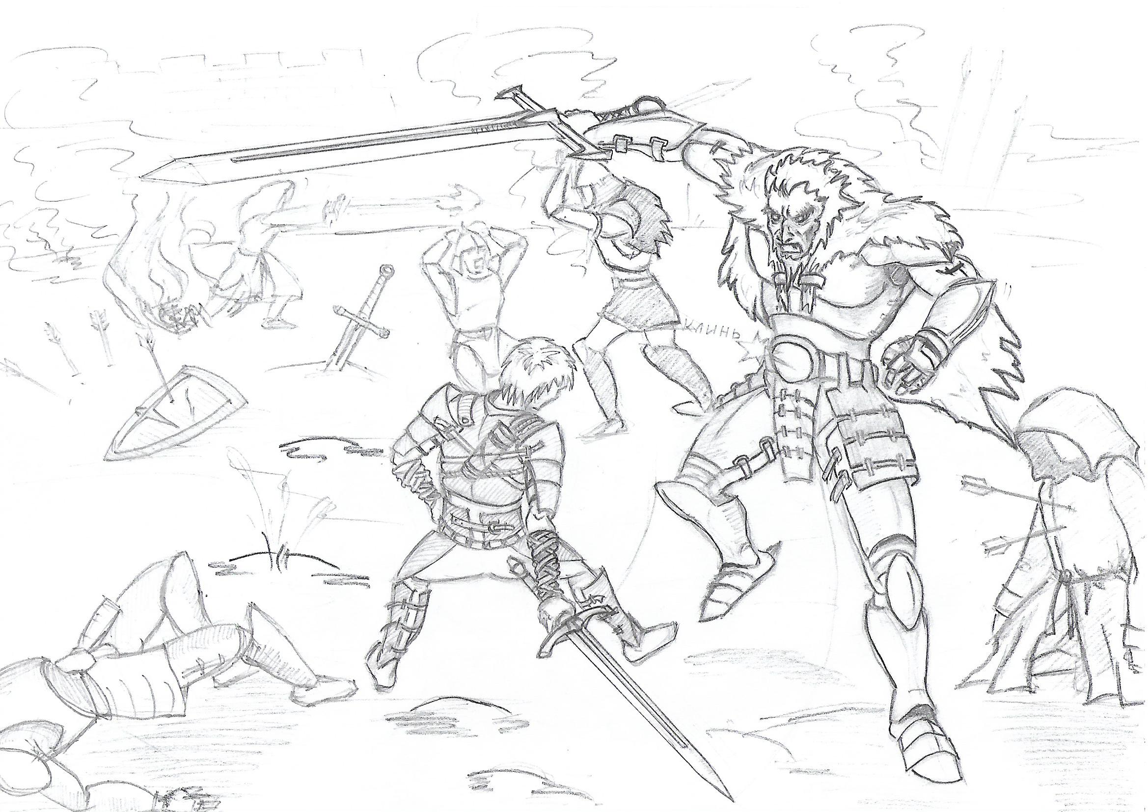 Воин использовал технику боя двуручным мечом, когда оружие непрерывно описывает в воздухе круги и восьмёрки. Юджин кружил и уворачивался, подныривал и уходил от мощных ударов, блокировать тяжёлый двуручный меч генерала своим клинком было бы опрометчиво. Несколько раз Юджину удавалось достать противника, но, похоже, это лишь раззадорило воина. Кэрролл понимал, что в скорости он проигрывает молодому и более быстрому сопернику поэтому, после очередного кругового взмаха мечом, когда Юджин с лёгкостью отклонился назад, уходя от удара, генерал резко выбросил свою руку и схватил мальчика за горло.