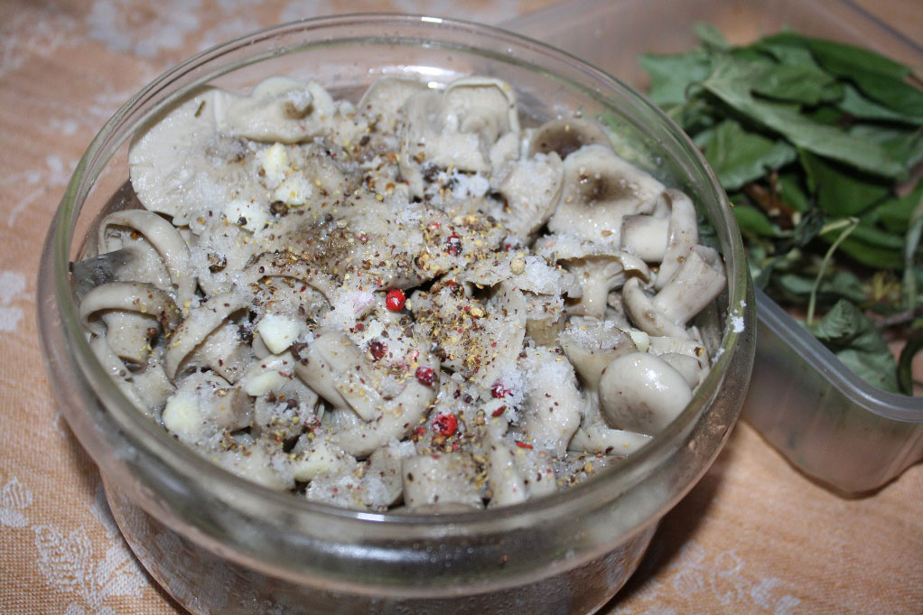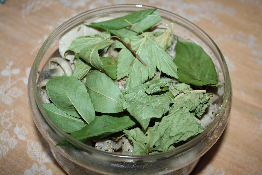 Горячие грибы укладывать слоями в подходящую стеклянную или керамическую емкость. Каждый слой посыпать солью, чесноком, перцем, пряностями и перекладывать сухими листьями. Сверху полить грибным бульоном.