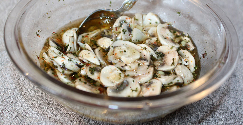 200 гр свежих шампиньонов, по 3 столовые ложки растительного масла и сока лимона, по 1 чайной ложке (с верхом) сахара, (без верха) морской соли и сушеной зелени сельдерея, 0,5 чайной ложки сушеной паприки (крошка), щепотка молотой коры коричного дерева (крошка), 2 зубчика чеснока, свежемолотая смесь перцев.