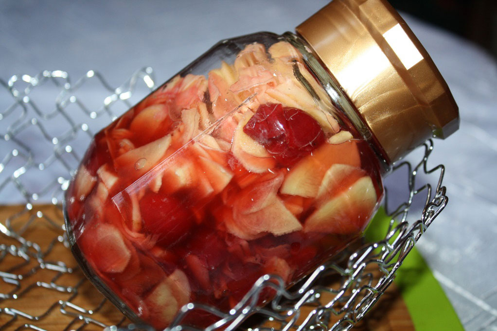500 гр корня имбиря, 100–150 гр свежей или замороженной вишни без косточек, 3 столовые ложки без верха сахара, 0,5 чайной ложки морской соли, 120 мл яблочного уксуса, 50 мл воды, 1 столовая ложка бренди.