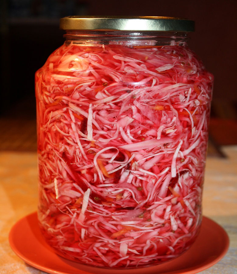 Сутки банку с капустой без крышки (можно горлышко банки обвязать холщовой салфеткой) выдержать при комнатной температуре (за это время два-три раза капусту перемешать). Далее держать капусту в холодильнике или на балконе, не допуская ее замерзания. Несколькими ложками рассола из капусты можно приправлять щи, борщи или на нем готовить соусы к отварной рыбе.