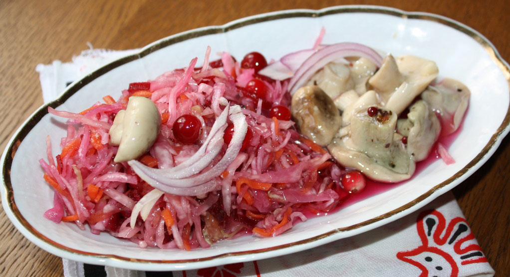 2,5 кг свежей капусты, 300 гр молодой свеклы (можно свеклу заменить таким же количеством капусты), 0,4 кг моркови, 0,5 стакана свежей или моченой клюквы, 2 столовые ложки с верхом соли, 1 столовая ложка сахара, по 0,5 чайной ложки тмина и семян горчицы, 1 литр воды.