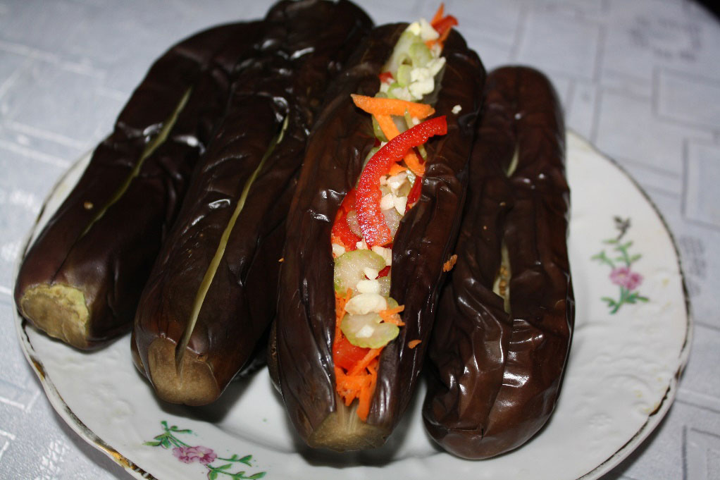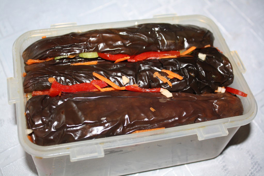 Баклажаны надрезать вдоль, начинить овощами и чесноком, плотно уложить в контейнер для засолки, залить маринадом, прижать легким грузом, оставить при комнатной температуре до полного остывания. Груз снять, в контейнер долить маринад. Хранить в холодильнике. Готовы через 2–3 дня после засолки.