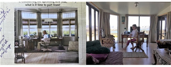 В мае 2019 года я перебирала старые дневники, и обнаружила старые записи с вдохновляющими картинками. Одна из них – рабочий кабинет моей мечты. Тогда, три года назад, я нашла в интернете и распечатала эту фотографию из фильма «Любовь по правилам и без». На фото – героиня фильма, известная писательница, которая пишет книги в своём рабочем кабинете с видом на океан. На картинке антураж, почти идентичный тому, что окружает меня с апреля 2019 года. В доказательство этого я сделала фото своего рабочего процесса прямо сейчас, завершая процесс работы над книгой. Сравните эти две фотографии. Признаюсь, я даже ощутила мурашки по всему телу. Насколько сильна оказалась визуализация. До деталей. В ежедневник «Points of You» я не заглядывала больше двух лет, и про эту вдохновляющую фотографию совершенно забыла. «Невероятно!» – пронеслось в мозгу, когда я открыла ежедневник на страничке со вклеенной картинкой. Она для меня очень глубоко эмоционально откликалась не только визуально. Сам фильм когда-то очень запал в душу. Я могла бы сделать сходство более явным, передвинув коврик и кое-что из мебели. Но даже в таком виде совпадение кажется почти мистическим. Хотя никакой мистики нет. Дальше в книге я всю эту мистику проанализирую и объясню с позиции логики.