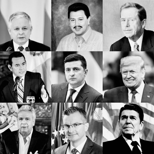 Кроме Владимира Зеленского многие другие артисты и комики занимали ведущие посты. Рис. 16. В Америке это Рональд Рейган, который стал президентом в 69 лет. В 2016 году президентские выборы в этой стране выиграл бизнесмен, предприниматель, шоумен и телеведущий Дональд Трамп. Джимми Моралес, президент Гватемалы с 2016 года, в течение 15-ти лет был комиком. Ленин Морено, президент Эквадора с 2017 года, значительную часть жизни посвятил смехотерапии и занял пост президента страны, будучи инвалидом в инвалидной коляске после ранения в спину. Марьян Шарец – выпускник Люблянской академии театра, радио, фильма и телевидения, стал президентом Словении в 2018 году. Последний президент Чехословакии и первый президент Чехии Вацлав Гавел был писателем и драматургом, потомком основателя кинокомпании «Люцернафильм». Бывший президент Польши Лех Качиньский вместе со своим братом-близнецом Ярославом сыграли главные роли в популярном в Польше детском фильме-сказке «О тех, кто украл Луну». Филиппины – бывший президент Джозеф Эстрада (реальное имя – Хосе Марсеело Эхерсиито) был известным филиппинским актёром. Он является пятикратным лауреатом филиппинской премии «За лучшую мужскую роль», и даже пять раз выигрывал премию «Лучший фильм».