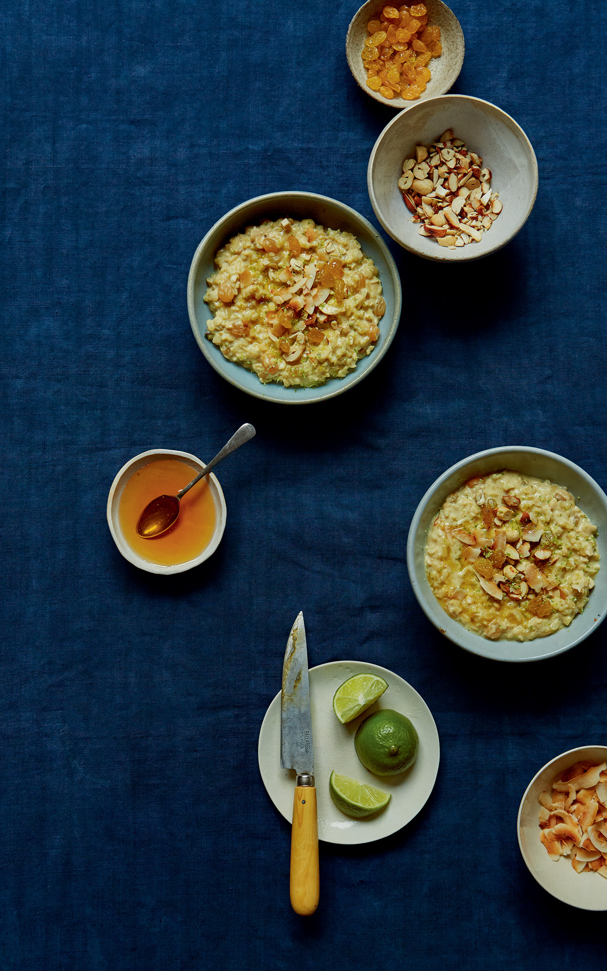 After 20 minutes add the nuts, raisins, spices and honey to the rice and cook for another 15 minutes until thick and creamy, somewhere between rice pudding and porridge. You want to reach the sweet spot where the rice is soft, with very little bite, and the kheer is creamy but not too thick. If it looks like it is thickening too fast, turn the heat down and top up with a little boiling water from the kettle. Serve spooned into bowls with the lime zest and coconut flakes on top; if you have a sweet tooth you could add a little extra honey on top.