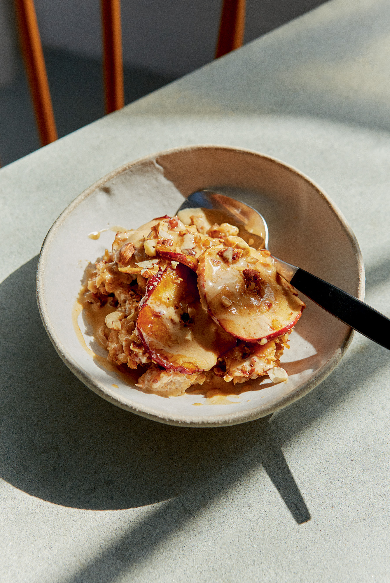 While the porridge bakes, make the maple cream. In a medium bowl, whisk together the nut butter, maple syrup, milk, salt and vanilla. You are looking for something totally smooth and pourable. If the mixture seems too thick, add a little more milk.
