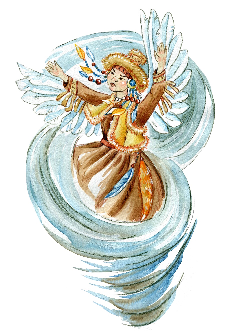 И действительно, как зачарованный, смотрел Квакахрям на бескрайние просторы, невысокие деревья и голубые зеркала воды. Все вокруг пело, свистело. И доносил ветер такую свежесть моря и леса, что у Квакахряма аж голова закружилась. А шаманка раскинула руки-крылья и побежала на встречу ветру, позвякивая украшениями. Полетел Квакахрям за ней, а когда закружилась она на месте, ощутил он радость неописуемую. И увидел он последний лучик солнышка, скрывающийся за горизонтом. И понял он, что все сделает для того, чтобы каждую весну журавли приносили солнышко в этот привольный край.