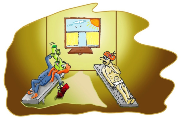 Раскаленный металл вагона создаёт атмосферу сауны. Мужики снимают рубахи, оставаясь в одних майках. Через десять минут снимают брюки… Женщины крепятся… Когда платья пропитались потом и прилипли к телу, сняли платья, остались в исподнем. Никто не обратил внимания на странные перемены в одежде пассажиров, все «помирали» от жары.