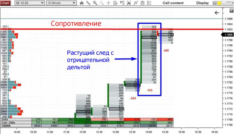 5. Когда цена достигла сопротивления на основе объема, между ценой и дельтой возникло значительное расхождение. Цена росла, а дельта падала! Это означало, что, хотя цена росла, сильные и агрессивные продавцы входили в рынок все больше и больше! Это одно из моих любимых торговых подтверждений, поэтому я вскочил в короткую позицию.