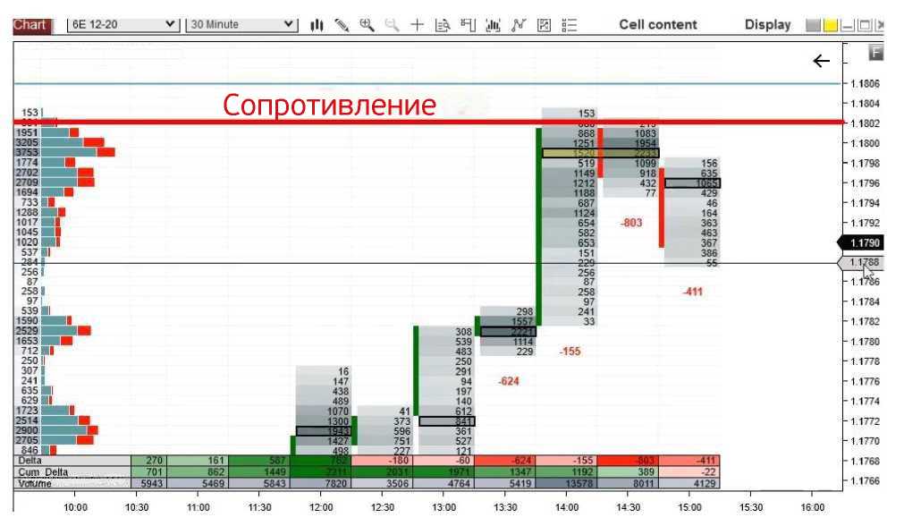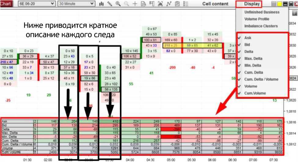 Такая панель является вполне стандартной для многих программных продуктов потока ордеров. Разработчики любят хвастаться тем, сколько полезных вещей она показывает. Правда в том, что вам не понадобятся все эти функции, поскольку они отвлекают от более важных аспектов. Лично я использую только показатели дельты, кумулятивной дельты и объема. Это дает мне быструю вводную информацию: