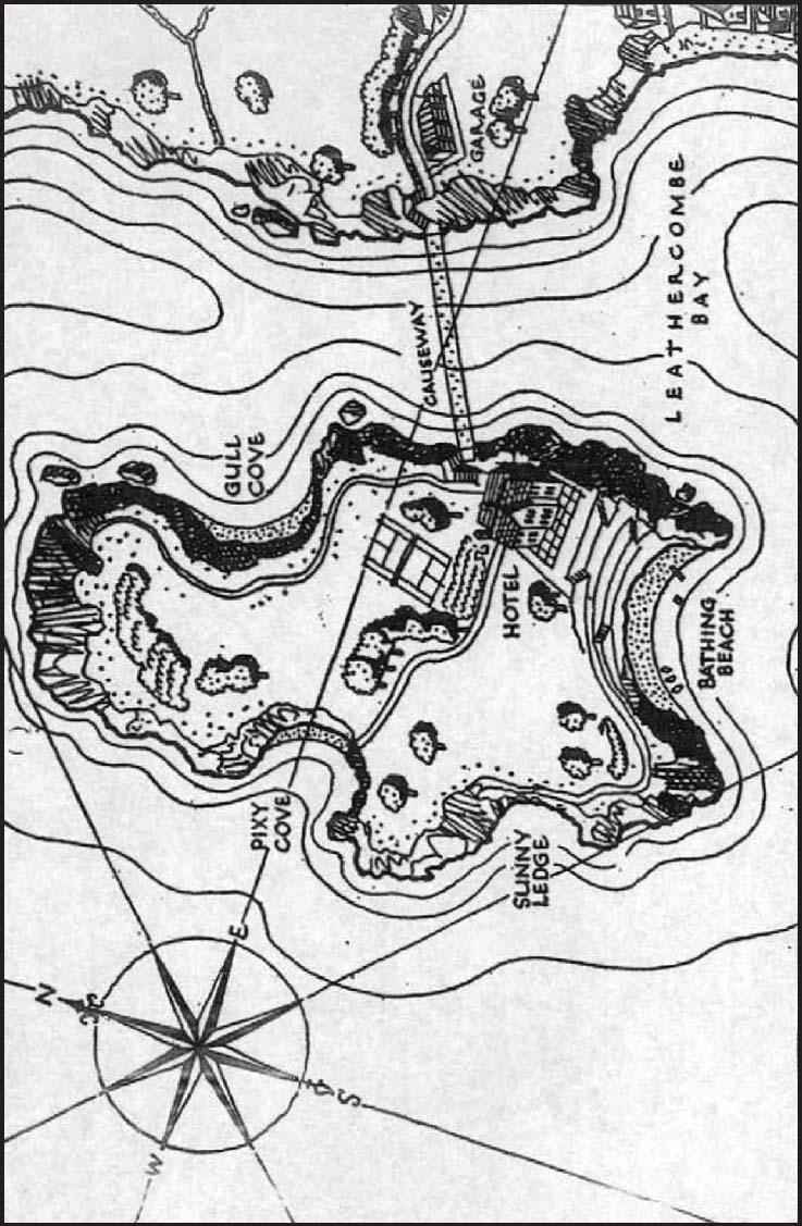 The sturdy house was added to and embellished. A concrete causeway was laid down from the mainland to the island. ‘Walks’ and ‘Nooks’ were cut and devised all round the island. There were two tennis courts, sun-terraces leading down to a little bay embellished with rafts and diving boards. The Jolly Roger Hotel, Smugglers’ Island, Leathercombe Bay, came triumphantly into being. And from June till September (with a short season at Easter) the Jolly Roger Hotel was usually packed to the attics. It was enlarged and improved in 1934 by the addition of a cocktail bar, a bigger dining-room and some extra bathrooms. The prices went up.