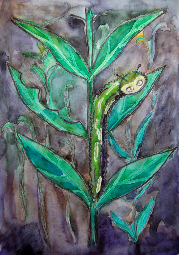 Паучок был заинтригован. Гусеница всё ела и ела, росла и росла, и вот однажды принялась выпускать из брюшка тонкую нить, так похожую на паутину, но гораздо красивее. Паучок уж обрадовался, что встретил родственную душу, но гусеница начала заматываться сама, образуя кокон. Теперь он совсем ничего не понимал, только смотрел и смотрел, во все свои восемь глаз.