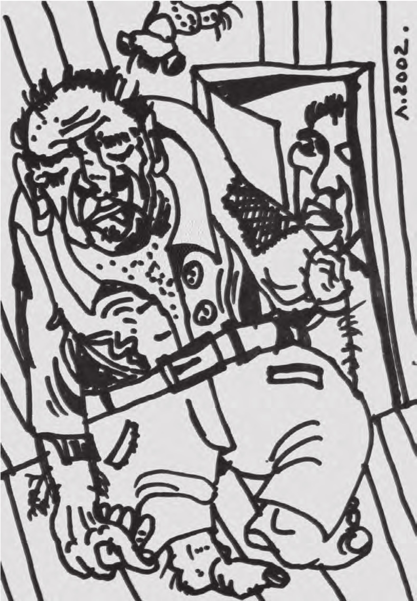 …Однажды Вадим, как обычно, вошел в лифт и нажал кнопку. Но ошибся, и вместо первого лифт остановился на восьмом этаже. Неожиданно для себя Вадим вышел, и что-то нелепое и странное сразу вошло в душу. Этаж был, видимо, еще не заселен, двери в, по-видимому, пустые квартиры были открыты, пахло краской, но чувство странности не оставляло Листова. Как будто на этом этаже отсутствовало все человеческое. Сердце его даже заныло. И сразу из одной из квартир (их было всего четыре) вышел невзрачный человек. Он не спросил Вадима ни о чем, но Листов, однако, попросил его объяснить, что здесь происходит. Человечек неуверенно бормотнул, что весь этаж кем-то куплен и теперь-де ремонтируется, хотя никаких особенных следов труда Листов не заметил. Неожиданно для самого себя Вадим спонтанно пошел прямо в квартиру, откуда вышел человечек. Вошел и ахнул. В квартире этой было человек восемь, и семь из них просто бродили из стороны в сторону, а у окна неподвижно застыл в позе мертвого убийцы огромный человечище с лохматой, словно у лешего, головой. Бродящие иногда останавливались около него, но так, что было непонятно, преклоняются ли они перед ним, или просто замирают на месте. Только один из этих людей не останавливался и бродил сам по себе, но все время хохотал, разевая широкую пасть-пропасть.