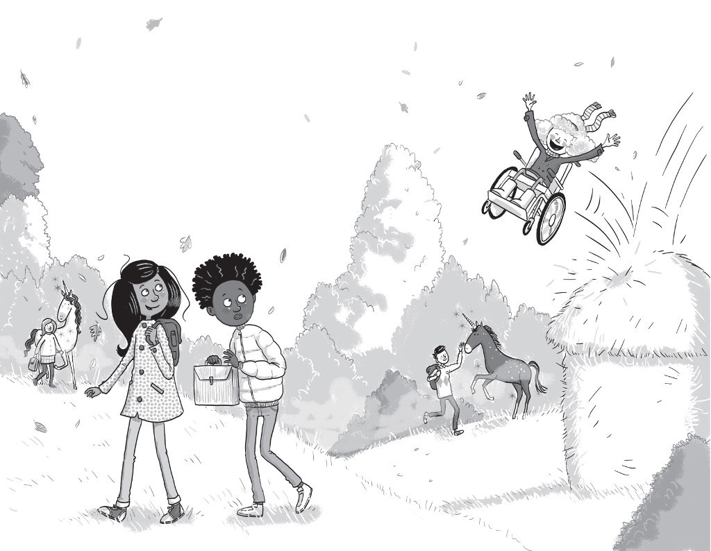 ‘Ta-daaaa!’ a voice sang out behind them on the haystack. Their friend Darcy launched off the haystack and did a spectacular spin in her wheelchair, ending with her arms in the air. ‘Did you miss me?’