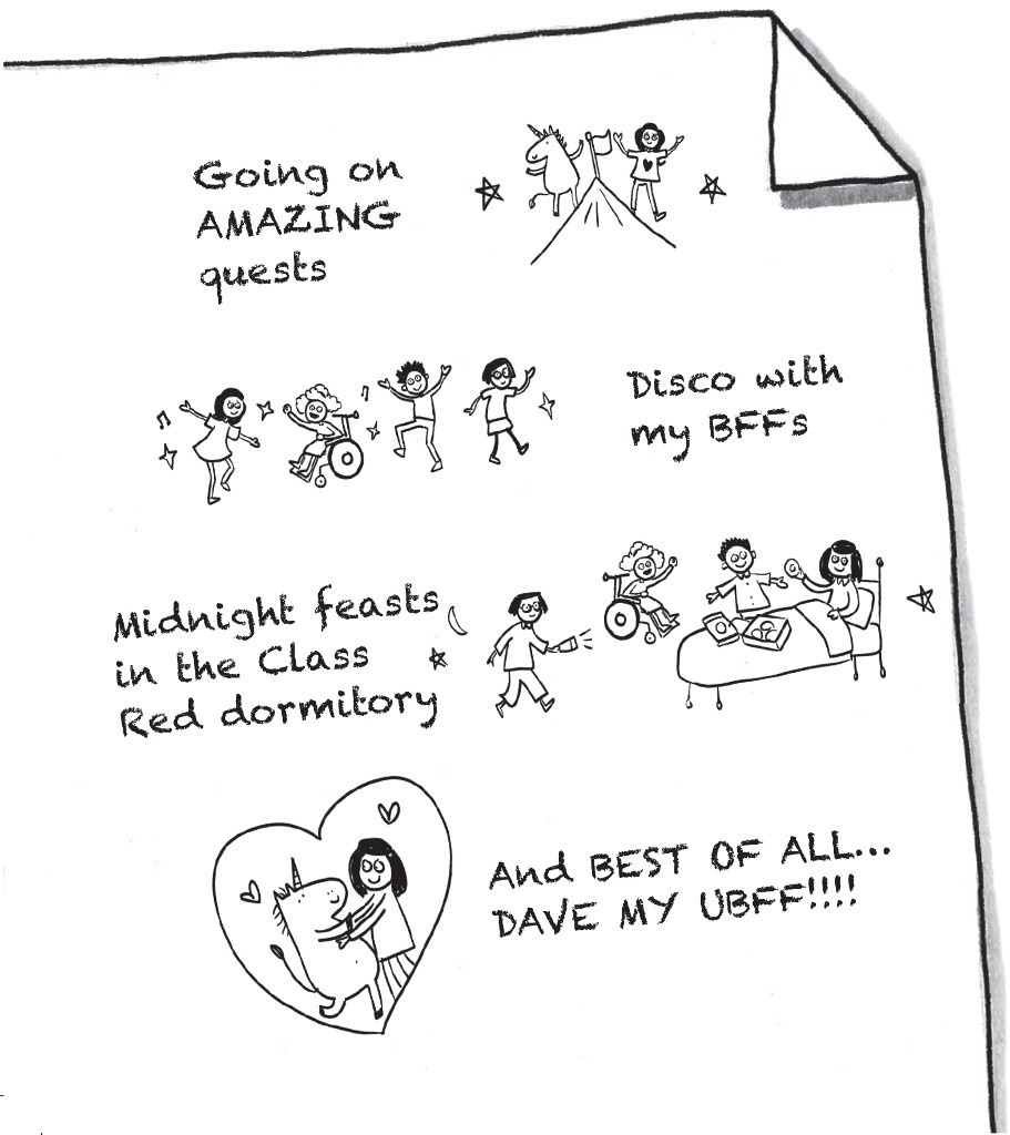 Later that night Mira lay in bed, too excited to sleep. She took out her diary from her bedside table and started thinking about all of the awesome things she was going to do with Dave. And with Darcy and Raheem – her two human best friends at Unicorn School.