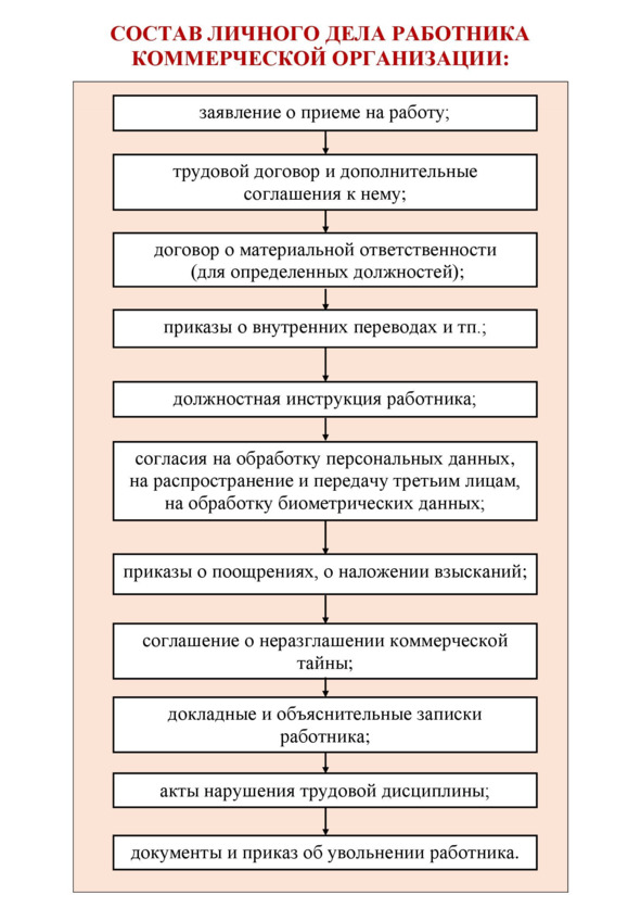 Т. к. для коммерческих организаций законодательством не предусмотрен конкретный порядок работы с личными делами, организация-работодатель также определяет его самостоятельно. Состав личных дел, требования к процедуре их оформления, ведения и передачи на архивное хранение рекомендовано зафиксировать в локальном нормативном акте организации (пример в Положении о ведении личных дел (см. в разделе 5). При этом необходимо обязательно учитывать требования Федерального закона от 27.07.2006 №152-ФЗ «О персональных данных» (далее – ФЗ 152). Запрашивать и хранить излишнюю информацию о работнике строго воспрещается, а в личные дела нельзя помещать документы, содержащие перс. данные работника (копии паспорта, СНИЛС, ИНН и др.) чтобы не нарушить его права и законодательство РФ, избежать штрафов со стороны проверяющих органов (подробнее в разделе 2).