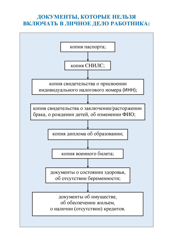 В личное дело не включаются документы с разными сроками хранения (приказы, заявления об отпусках, отгулах, медицинские справки, больничные листы и тп.) и документы с персональными данными работника (паспорт, СНИЛС, ИНН и др.).