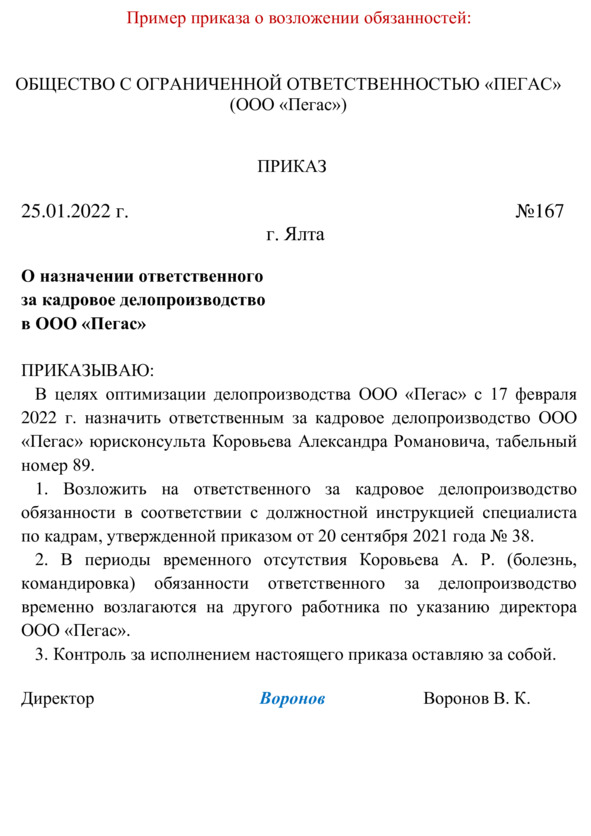 – сотрудник, назначенный ответственным за ведение кадрового делопроизводства. Часто на практике в небольших организациях ведение личных дел и кадрового делопроизводства в целом является дополнительной обязанностью для секретарей или бухгалтеров и оформляется как внутреннее совместительство в соответствии с Трудовым Кодексом РФ (ст. 60.1, 282, 285). Это может быть не полная ставка, а, например, 0,5 ставки, если объем работ небольшой.