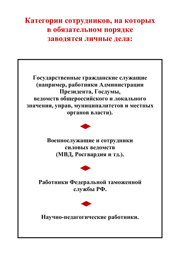 Что же касается государственных служащих, то личные дела на них заводятся в обязательном порядке по месту прохождения службы (в федеральных, государственных и муниципальных ведомствах, организациях и учреждениях). Обязанность по формированию, учету и хранению личных дел госслужащих и лиц, к ним приравненных, регламентируется Федеральным законом от 27.07.2004 №79-ФЗ «О государственной гражданской службе Российской Федерации» и Федеральным законом от 02.03.2007 №25-ФЗ «О муниципальной службе в Российской Федерации».