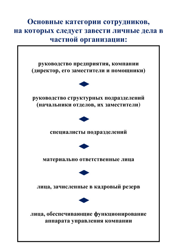 Формирование, ведение, учет и хранение личных дел является обязательным не для всех работодателей. Коммерческие организации, не являющиеся источником комплектования гос. и мун. архивов, и индивидуальные предприниматели могут не вести личные дела сотрудников, но на практике многие из них все же делают это для систематизации делопроизводства, а также для быстрого и удобного поиска нужных сведений о деятельности конкретного работника, содержащихся в кадровых документах его личного дела. Т. е. для коммерческих (частных) организаций ведение личных дел своих сотрудников – это право, а не обязанность. К тому же, работодатель вправе сам решать на какие категории сотрудников заводить личные дела в его компании.