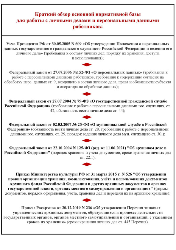 Законодательством предъявляются жесткие требования к составу, порядку хранения, доступа и использования личных дел гос. служащих. Основным нормативным актом, регламентирующим эти требования, является Указ Президента РФ от 30.05.2005 N 609 «Об утверждении Положения о персональных данных государственного гражданского служащего Российской Федерации и ведении его личного дела».