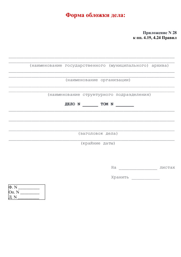 Форма обложки дела (титульного листа) указана в приложении №28 к Правилам 2015, а в пунктах 4.25, 4.28, 4.29 содержатся требования к реквизитам, которые должен содержать бланк титульного листа дела: