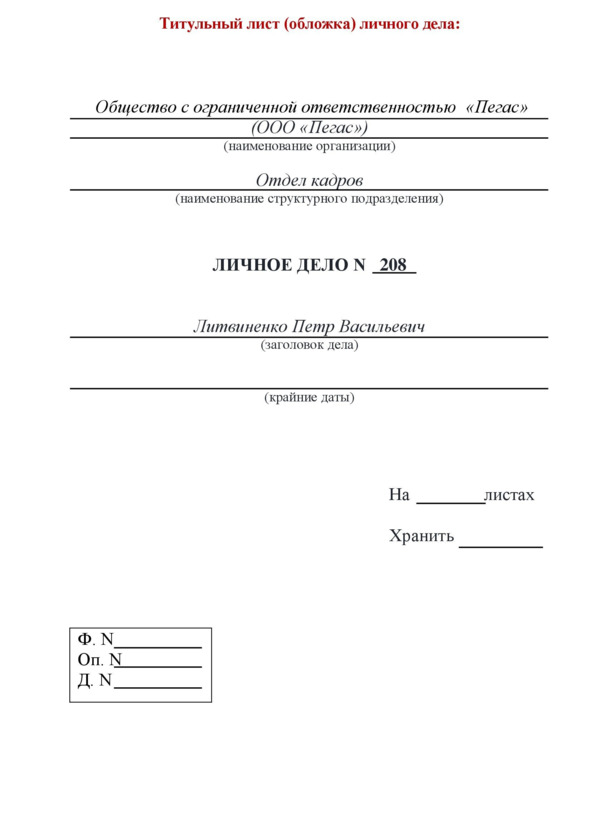 – заголовок дела (фамилия, имя и отчество сотрудника, на которого заведено личное дело);