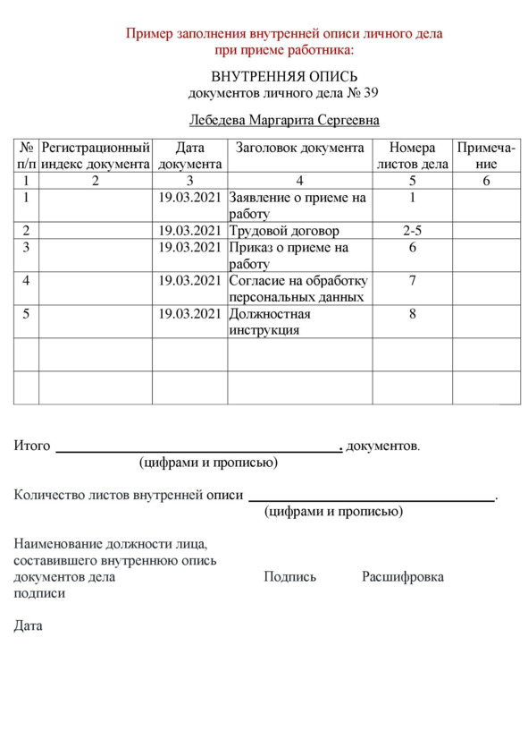 Итоговая запись заполняется после увольнения работника, а дело закрывается в делопроизводстве. Обычно к этому моменту внутренняя опись располагается на нескольких страницах, т. к. за время работы сотрудника в личном деле может скопиться большое количество документов.