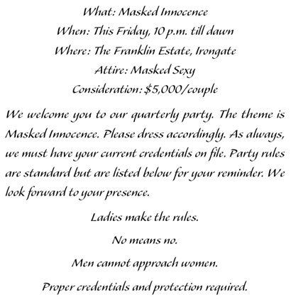 Well, this is convenient. Twenty-four hours after Brad mentions a sex party, a hot man shows up in my office, envelope in hand. I tapped the invitation against my desk and thought. I had shot out a response to Brad, not really thinking through the implications of what I was signing up for. I wasn’t ready for this. A threesome was one thing. A masked orgy was something entirely different. I had to remember what Brad had said. We could just stop in, see how it works and leave. I could handle that. Piece of cake.