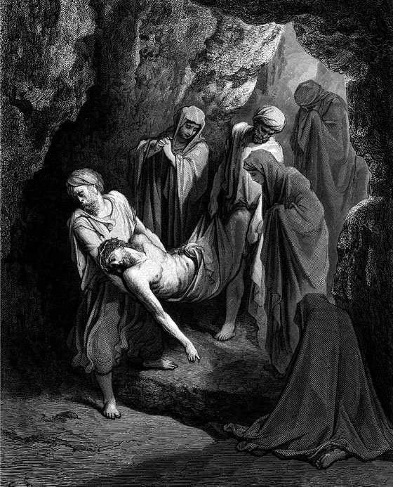 Иосиф пошел и купил новую плащаницу (большую простыню), а Никодим принес почти сто фунтов душистой, благовонной (хорошо пахнущей) мази из смирны и алоэ. Иосиф с Никодимом сняли с креста тело Иисусово, смазали его душистой мазью, спеленали плащаницей, голову обвязали платком – сделали все по иудейскому обряду. У Иосифа возле Голгофы был сад, где в каменной скале он велел сделать пещеру, в которой должны были похоронить его самого. Вы, конечно, помните, что такие пещеры у евреев назывались гробами. Добрый Иосиф так любил Иисуса Христа, что не пожалел для Него своего нового гроба, в котором еще никто не был похоронен. Сюда и внесли Иосиф с Никодимом тело Господне. Вход они завалили большим камнем.