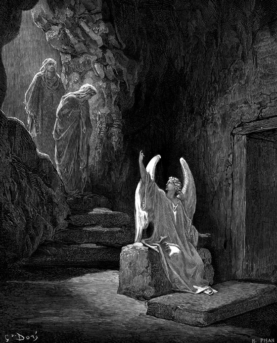 Женщины испугались. Тогда один из ангелов сказал им: «Не бойтесь! Я знаю, что вы ищете Иисуса Назарянина, который был распят. Его здесь нет. Он воскрес, как и говорил раньше. Подойдите, посмотрите: вот место, где Он лежал. Скорее идите и скажите Петру и остальным Его ученикам, что Он воскрес и встретит их в Галилее. Увидите Его там, как Он вам и сказал. Вспомните: Он говорил, что Сын Человеческий будет предан в руки грешников, будет распят и на третий день воскреснет.