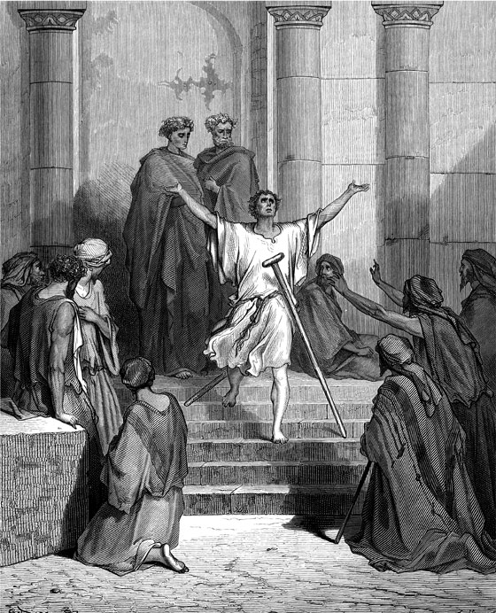 Однажды Петр и Иоанн шли в храм. У главных дверей храма, которые назывались Красными, сидел хромой, который сам не мог ходить. Каждое утро его приносили и сажали у дверей. У всех, кто шел в храм, он просил милостыню. Стал просить он и у Петра, но тот сказал: «Денег у нас нет, и я дам тебе, что могу. Именем Иисуса Христа встань и ходи!» И, взяв хромого за правую руку, поднял его. Тот встал и пошел. Весь народ видел это чудо. Все знали этого нищего, который столько лет сидел у ворот храма, а теперь от одного слова Петра смог пойти. После этого апостол стал рассказывать людям об Иисусе Христе, что это Сын Божий, Которому нужно молиться. За эту проповедь священники схватили Петра и Иоанна и посадили в темницу (тюрьму), а затем отвели в синедрион (иудейский суд) и строго запретили проповедовать народу Иисуса Христа.