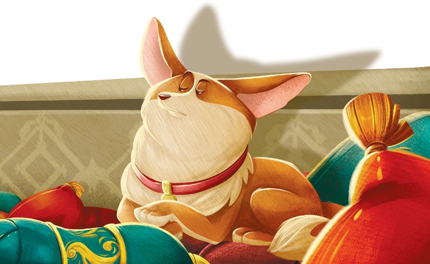 Королевский корги Фокс невозмутимо лежал на алых подушках, помахивая идеально расчёсанным хвостом.