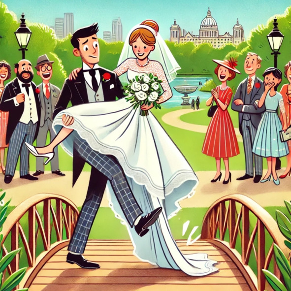 – Ваня, будь аккуратен, тут грязь, а платье итак сегодня уже пострадало! – взволнованно с унылой гримасой на лице говорила Света, в то время как Ваня с трудом перешагивал через неровности на мосту, пытаясь не уронить её и одновременно не наступить на волочившееся по земле платье.