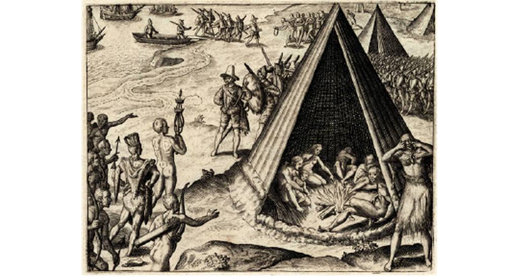 Гравюра Теодора де Бри «Прибытие Дрейка в Калифорнию»