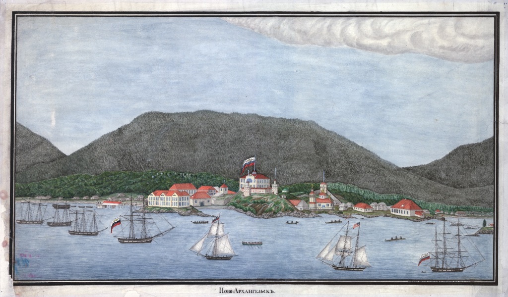 Ново-Архангельск (в настоящее время американский город Ситка), Аляска, Русская Америка, основанный в 1799 году, на акварели, подписанной «креолом Александром Ольгиным»