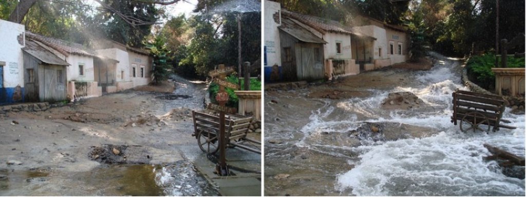 Затем наш автопоезд приехал в небольшую «мексиканскую деревушку», где резко начался дождь, переходящий в ливень, вода стала прибывать, и вскоре случилось настоящее наводнение и потоп! Ревущие потоки воды стремительно понеслись по улочкам, сметая все на своем пути, и должны были смести и нас вместе с вагончиками. Но совершенно неожиданно вода стала сворачивать в сторону, потоки быстро уменьшались, и прямо у колес вода остановилась и потекла обратно.