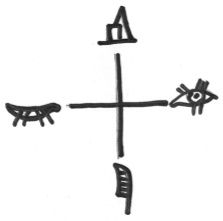 В поисках выхода из создавшегося положения, Артём Тарасович решил воспользоваться, по примеру неграмотных предков, символическими знаками, в которых будет прослеживаться аналогия между понятием и изображением. Запад решил изобразить в виде закрытого глаза, рассудив, что заход солнца легко ассоциировать со сном. Так как рисовальщиком Артём был не ахти каким, прикрытое веко на рисунке получилось больше похожим на лодку с повисшими вёслами. Зато открытое око востока («солнце встало – пробудись!») вышло вполне узнаваемым. Воодушевившись успехом, Артём продолжил свою работу. Юг как направление полёта птиц на зимовку приобрёл символику пера. При обозначении севера в памяти возникла глыба льда, айсберг, под рукой неумелого художника превратившийся в пирамидку с ломаной линией сбоку.