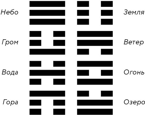 Сплошные или прерывистые линии яо составляют систему. Комбинации этих линий образуют знаки гуа, которые в зависимости от количества входящих в них черт могут представлять собой диграммы (две черты), триграммы (три черты) и так далее. Восемь триграмм, составленных из различных комбинаций яо, дали начало космологии, олицетворяя собой различные стихии и явления природы.