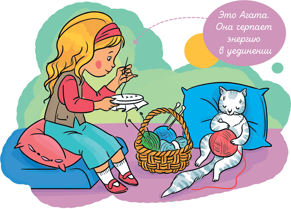 Агата, наоборот, совсем другая. Она не рвется общаться и часто держится в стороне от всех. Кто-то считает ее робкой и стеснительной, кто-то высокомерной. Но ни то, ни другое – неправда. Просто Агата, в отличие от Гриши, черпает энергию не из общения, а находясь наедине с самой собой. Ей нравится проводить время в своей комнате или на любимой скамейке в парке. Мечтать, читать, слушать музыку, вышивать, наблюдать за своими мыслями. Таких людей, как Агата, называют интровертами. Интровертам нужно время, чтобы привыкнуть к чему-то новому – новым людям или новой обстановке. Они не против общения, но им его много не надо, они от него быстро устают. И им нужно «отползать» от окружающих в свой безопасный уголок, чтобы «перезарядиться». Интроверты меньше говорят и больше слушают. Они любят уединение, но всегда найдут время для важных для себя людей.