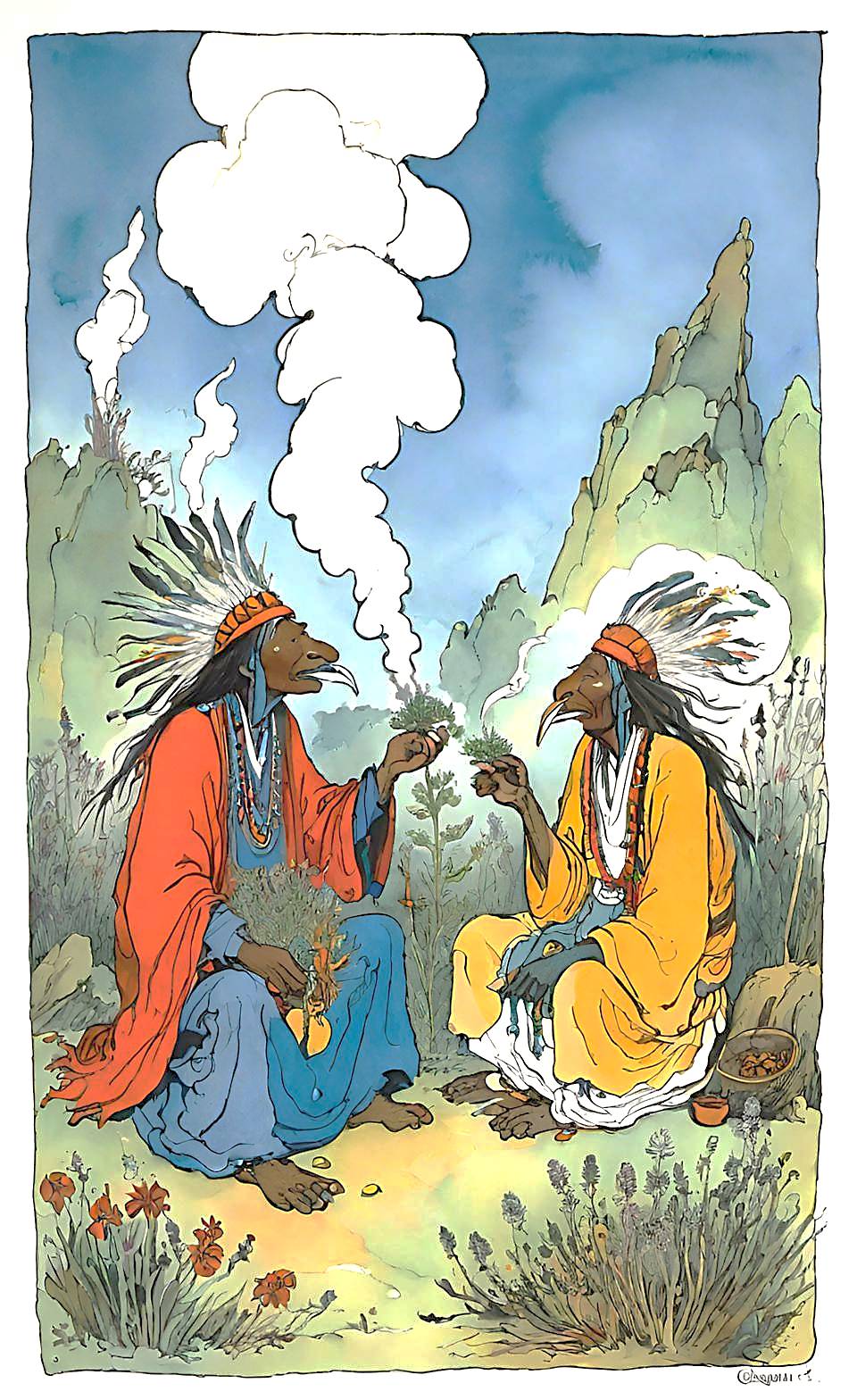 Иван подошёл к костру и увидел, что шаманы передают друг другу какой-то порошок и вдыхают его через деревянную трубочку.