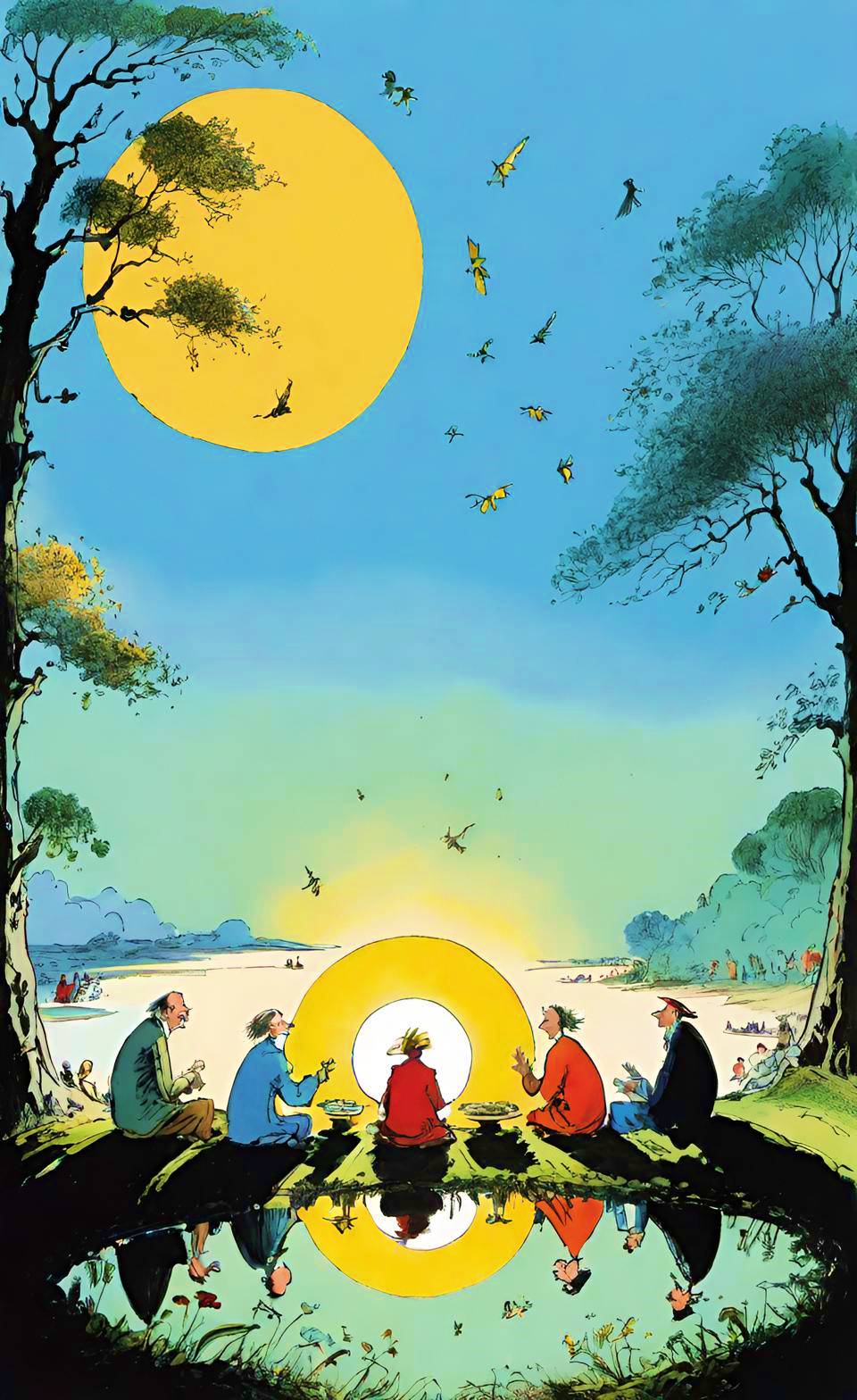 Иван собрал свой узелок и отправился в путь. Каково же было его разочарование, когда оказалось, что прана – и не еда вовсе. Люди в поселении питались солнцем. В обед они подставили кастрюлю солнцу, и, когда она нагрелась, опустили в неё половник и разливали солнечный свет по мискам.