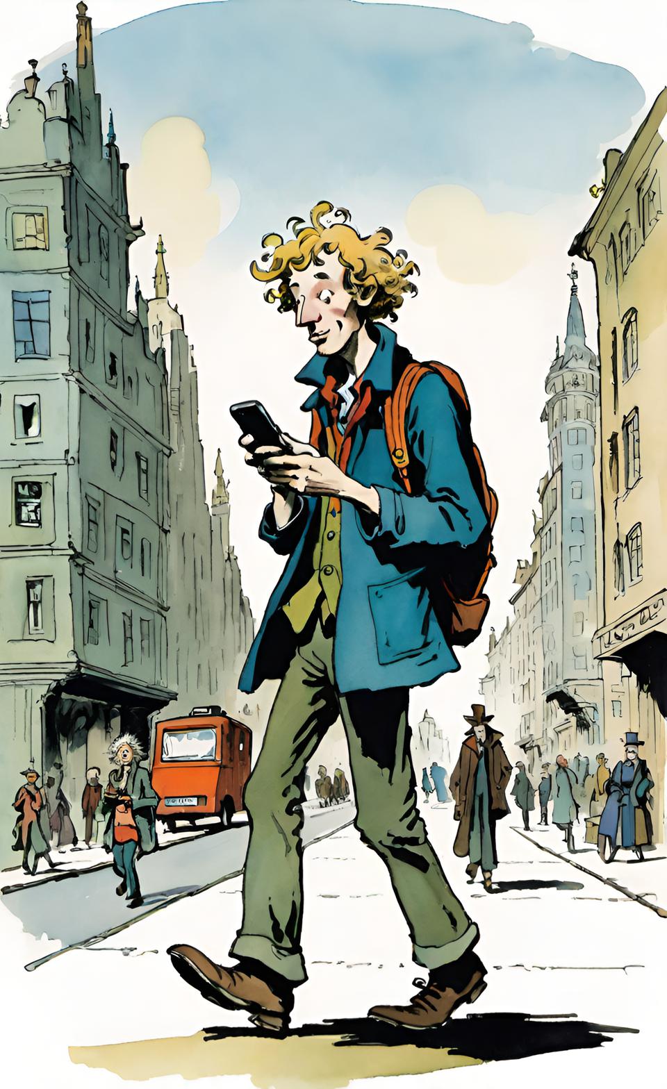 Иван вылез из машины, потрогал голову – на ней была шишка – и пошёл вперёд. Казалось, он попал на другую планету. Все прохожие были подключены к каким-то устройствам, черным плоским пластинам размером с ладонь. Люди держали устройства в своей ладони и пялились в черную пластину. "Как они не натыкаются друг на друга" – подумал Иван. – "А, понял! Они ориентируются на слух, как летучие мыши! И на эти цветные огоньки. Красный – стоять, зелёный – идти".