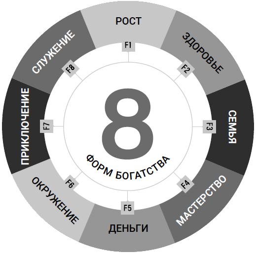 Модель «Восемь форм богатства» основана на восьми тайных (потому что о них не принято говорить) привычках, которыми стоит овладеть каждому. Вот они.