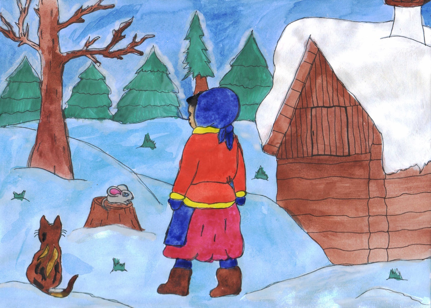 Мышонок, соскочил с пенька, ловко и быстро устремился в избушку, в которой находились большой свирепый медведь, который стоял как вкопанный со стеклянными совсем не живыми глазами. И рыжеволосая женщина, сидевшая на стуле и долго смотревшая на языки пламя в камине. Мышонок Пини набрался смелости и подбежал близко к стулу, где сидела эта женщина, но она совсем не обратила на мышонка внимания, в комнате стояла полная тишина, и только мышонок Пини мог ее нарушить, своим писком. В течении, какого-то времени все стояли не подвижны, затем мышонок Пини, решил вернуться на улицу к девочке Даши. Как вдруг женщина с рыжими волосами заговорила. Она говорила, о каком-то мальчики, что она должна его найти, и найти звезду желаний. Для мышонка Пини все ее слова казались бессмысленно, еще какое-то время он послушал ее и выбежал на улицу к девочке Даши. Мышонок рассказал ей все что слышал там, и видел. Даша, все понимала, о чем был там разговор, что она охотиться за звездой желаний. И как она может найти звезду, если она совсем растаяла и превратилась в воду, подумала Даша. И еще было не понятно, что за мальчик и кого она хочет найти с помощью ее. Девочка, усадила мышонка к себе в теплый карман, и они стали наблюдать с кошкой Машкой, что будет происходить дальше.
