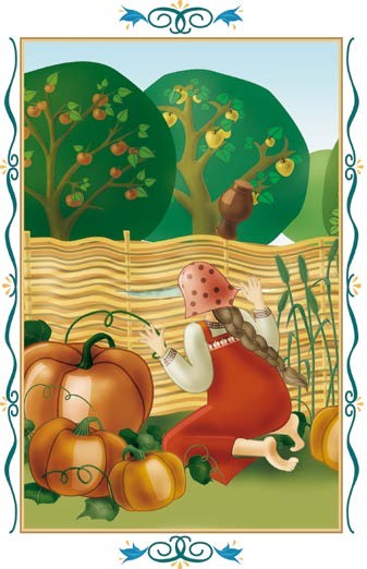 На другое утро, лишь заглянуло солнышко в маленькую спаленку красивой бедной девушке, она проснулась и побежала в огород. Приблизилась к чужому плетню. В саду никого не было видно. Встала она на колени, плетень раздвинула. Близко в траве яблочко лежало, еще покрытое росой. И только она руку протянула, чтобы взять его, как кто-то цепко ухватил ее за руку. Она хотела закричать, но чей-то голос предупредил ее: